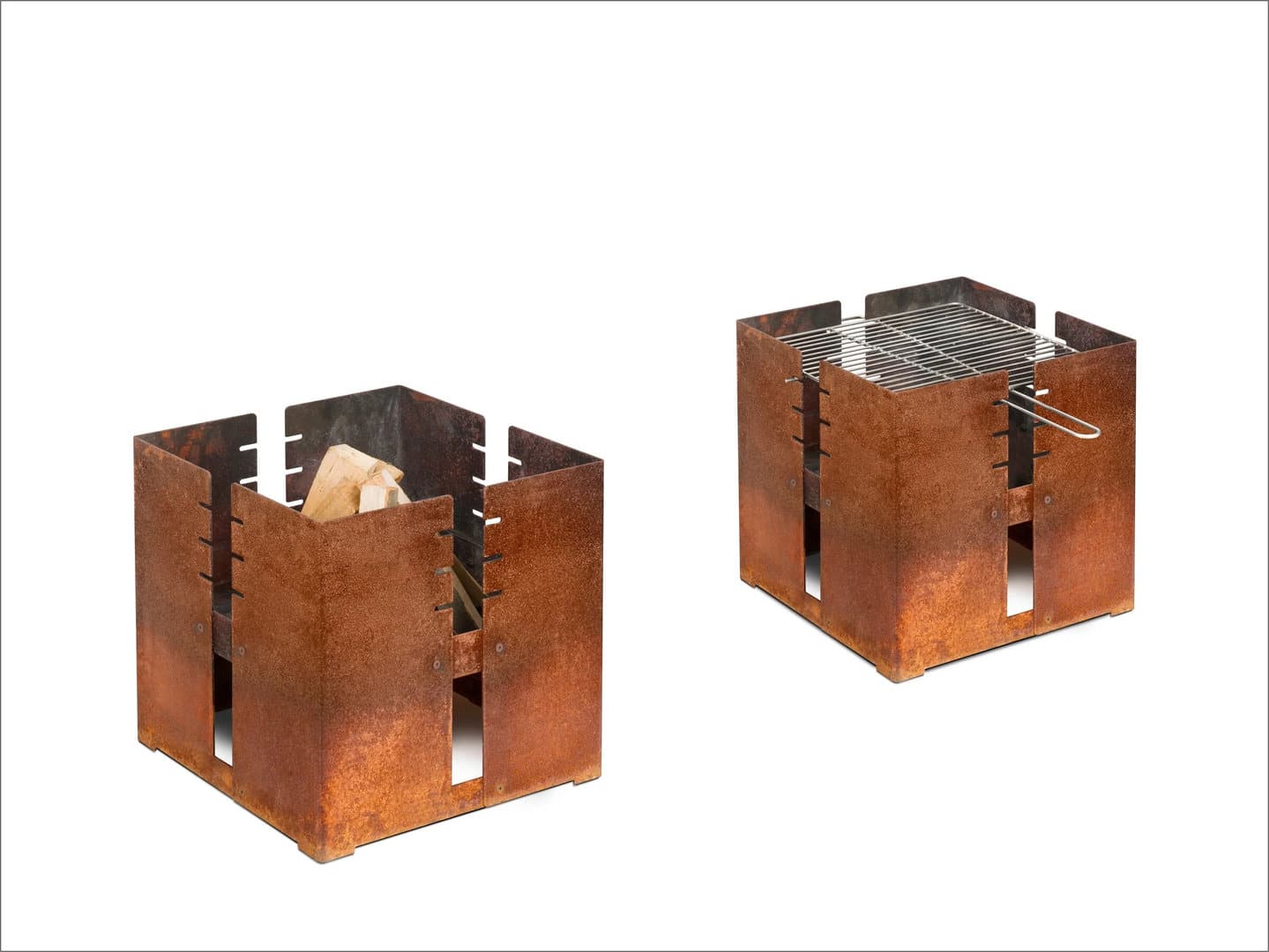 Aus diesem Grund wird wetterfestes Stahlblech verwendet, das im Lauf der Zeit oxidiert, was dem Erscheinungsbild der Feuerstelle Fidibus