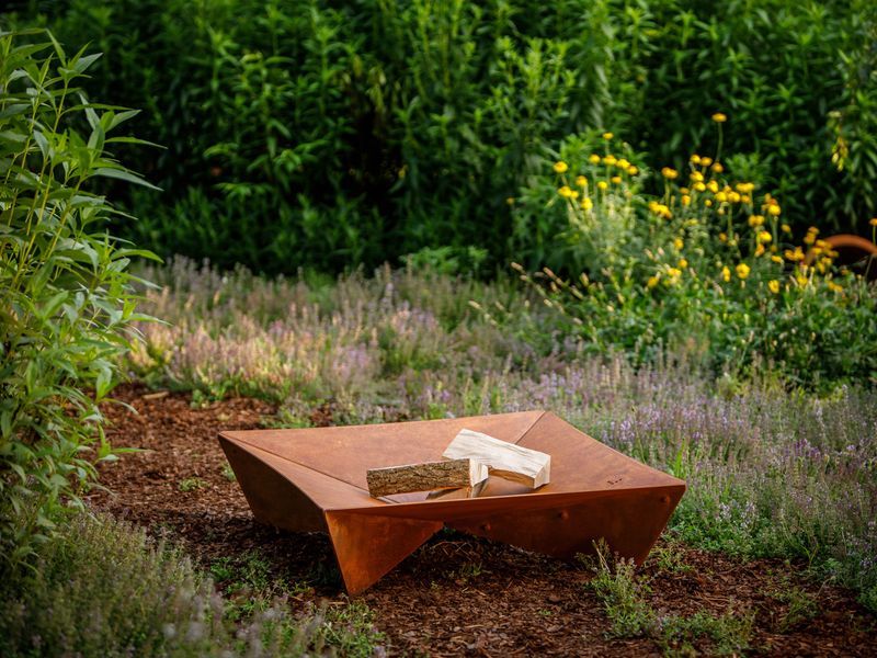 Aus diesem Grund wird wetterfestes Stahlblech das im Lauf der Zeit oxidiert verwendet, was dem Erscheinungsbild der Feuerstelle
